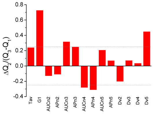 In order to visually inspect and explore single-parameter dissimilarities between HC and LCP groups, size effects were estimated through an adapted Cohen d index, calculated as the difference between the median values normalized by the pooled (weighted-average) interquartile range for each parameter (that is, median values and interquartile ranges were employed, instead of average values and standard deviations). Therefore, not only the difference in the median for each parameter is evaluated, but also how large this difference is compared with the parameter dispersion. Figure 2 shows the normalized median difference for each parameter, and seven parameters (Tav, G1, AUCn3, APn3, AUCn4, APn4, and Dv5) emerge individually as the statistically most important parameters for distinguishing both groups.