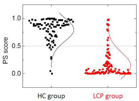 As a fixed set of parameters is required to define the complete model, we will only consider model 3 based on the complete set of TLB-derived parameters in order to calculate the probability (PS score) of an individual being healthy or suffering from lung cancer given the TLB thermogram. It must be emphasized that this probability, as a diagnostic tool, has to be understood as an assessment index: the smaller the PS score (closer to 0) for an individual, the higher the probability the given subject suffers from lung cancer; the larger the PS score (closer to 1) for an individual, the higher the probability the individual is healthy. It is important to emphasize that the PS score is not the probability of being healthy or suffering from lung cancer, but the probability of having an unaltered/altered protein serum TLB thermogram; an altered TLB thermogram might be induced or caused by lung cancer. That correlation between a lung cancer condition and altered TLB thermogram is supported by the good performance of our model in classifying and discriminating HC and LCP groups.