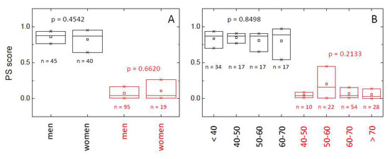 Distribution of the probability score (PS) within healthy individuals (HC group, black) and lung cancer patients (LCP group, red) according to gender (A) and age (B). The box-plot diagrams indicate Q1, Q2, and Q3, together with the average value (square). The number below each box is the number of subjects within each subgroup. The p-value (Kruskal–Wallis test) indicates there is no statistically significant difference between subcategories (gender and age) within HC and LCP groups (p > 0.05).