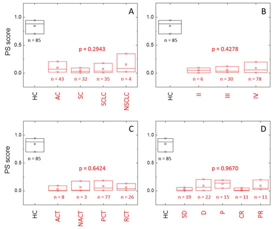 Distribution of the probability score (PS) within healthy individuals (HC group, black) and lung cancer patients (LCP group, red) according to (A) diagnostic (AC: adenocarcinoma, SC: squamous cell lung cancer, SCLC: small cell lung cancer, NSLC: other non-small cell lung cancer), (B) stage, (C) treatment (ACT: adjuvant chemotherapy, NACT: neoadjuvant chemotherapy, PCT: palliative chemotherapy, RCT: radio-chemotherapy), and (D) response (SD: stable disease, D: death, P: progression, CR: complete response, PR: partial response). The box-plot diagrams indicate Q1, Q2, and Q3, together with the average value (square). The number below each box is the number of subjects within each subgroup. The p-value (Kruskal–Wallis test) indicates there is no statistically significant difference between subcategories (diagnostic, stage, treatment, and response) within HC and LCP groups (p > 0.05).