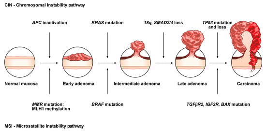 The conventional model, the so-called adenoma-carcinoma sequence, is histologically homogeneous and morphologically characterized the adenoma, including tubular or tubulovillous adenoma, as a precursor lesion [1]. The adenoma-carcinoma sequence is a multistep mutational pathway, in which each histological alteration is the consequence of a molecular dysregulation [9,10,11,12]. At the molecular level, this model recognizes a heterogeneous background, based on two mechanisms of tumorigenesis: (i) chromosomal instability (CIN) or (ii) microsatellite instability (MSI) [13,14,15,16] (Figure 1).