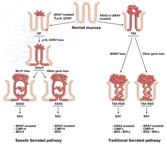 TSAs can progress toward dysplasia via two different molecular pathways [116]. Usually, TSA lesions which harbor KRAS mutations evolve toward conventional adenomatous dysplasia, while TSAs, which display BRAF mutations progress toward serrated dysplasia. Moreover, both dysplastic lesions can advance toward HGD due to aberrant promoter methylation of some genes. Among these latter, MGMT is usually associated with CIMP-L and MSS status (Figure 3). Finally, progression toward invasive carcinoma is driven by TP53 alterations [116].