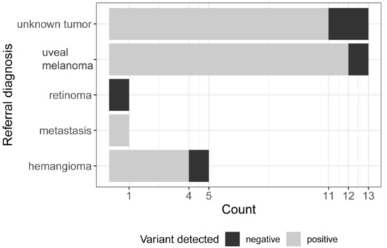 Referral diagnosis. Horizontal bars indicate the number of different referral diagnoses. Black: negative—no variant detected. Grey: positive—GNAQ p.Q209 variant detected.