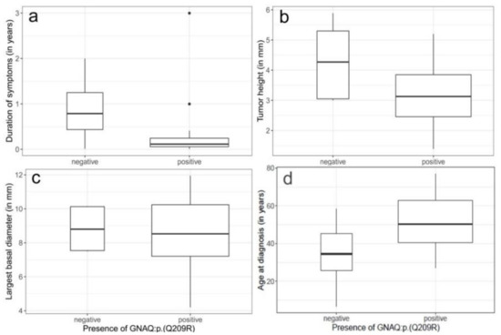 (a–d) Distribution of clinical characteristics between the mutation negative and mutation positive cohort. (a) duration of symptoms, (b) tumor height, (c) largest basal diameter, and (d) age at diagnosis. Boxplots with median represented as a solid line. Rectangles show the interquartile range. Width of the rectangles corresponds to the number of patients. None of the tested correlations is statistically significant.