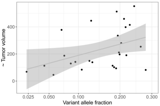 Linear regression of tumor volume on variant allele fraction (VAF) in 28 mutation positive samples. There is a trend of larger tumors showing higher VAF (p = 0,0179).