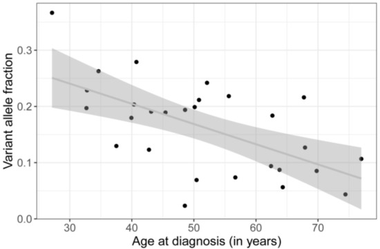 Linear regression of tumor volume on variant allele fraction (VAF) showed a positive correlation (p = 0.0179, see Figure 3), whereas age at diagnosis was negatively correlated with the VAF (p = 0.000659) (Figure 4). Duration of symptoms, which is the time period reported by the patient at initial presentation during which e.g., visual disturbances have been observed, is not associated with age at diagnosis (Supplementary Materials Figure S2).