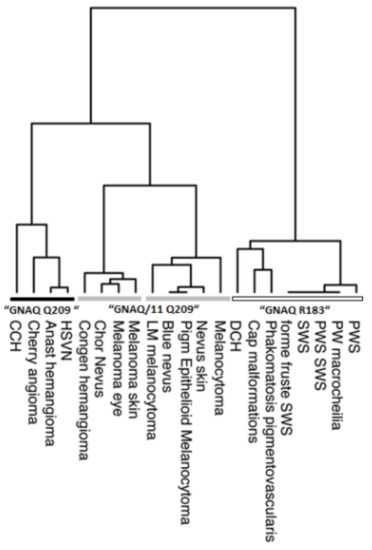 Tumor entities that contribute to the cluster that is dominated by variants at GNAQ p.R183 are congenital tumors/vascular malformations such as port wine stains, portwine macrocheilia and Sturge-Weber Syndrome, non-Sturge Weber capillary malformations, and diffuse choroidal hemangioma, as well as phakomatosis pigmentvascularis [13,19,20,21,22,23,26,27,28]. These malformations/tumors are diagnosed early in life, and patients often show somatic mosaicism for the variant alleles in non-neoplastic cells. A disorganization of perivascular cells is seen in these congenital tumors/vascular malformations instead of cell proliferation. Somatic mosaicism implies that the underlying mutation (mostly R183) has occurred prenatally during embryonic development in undifferentiated cells. From the phenotype observed in patients, it appears that these cells have a limited proliferative activity in adulthood. By contrasts, tumor entities that contribute to the second and third main clusters, which is predominated by alterations resulting in GNAQ or GNA11 p.Q209 (indicated by grey bars), mostly show later age at diagnosis and therefore are presumably initiated during adulthood. Congenital hemangioma of the skin (RICH and NICH), which also cluster within this group, are an exception [10]. Other neoplasms that belong to this cluster are melanocytic tumors, specifically melanocytoma, nevus of the skin, blue nevus, choroidal nevus, choroidal melanoma, and vascular tumors like congenital hemangioma, hepatic small vessel neoplasia, anastomosing hemangioma, cherry angioma, and circumscribed choroidal hemangioma [9,10,12,13,14,15,16,17,18,29,30,31,32,33]. It is common for these tumors that make up this cluster to show continuous cell proliferation.
