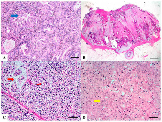 LELCs are composed of poorly differentiated cells arranged in solid nests, tubules and trabeculae with poorly demarcated, infiltrative margins. Inflammatory lymphoid infiltrate is extremely abundant and, differently from medullary carcinoma, is intratumoral rather than peritumoral, permeating between neoplastic cells (Figure 3A) [41]. Lymphoid follicles with germinal centers are usually present.