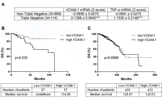 980 breast cancer patients of The Cancer Genomic Atlas (TCGA) were analyzed for VCAM-1 mRNA levels and subsequent overall survival (OS) follow-up (Figure 1). VCAM-1 expression was higher in TNBC (n = 114) as compared to non-TNBC patients (n = 866) (p < 0.001, Figure 1A). High VCAM-1 expression was associated with decreased OS in TNBC but not in non-TNBC patients (respectively p = 0.035 and p = 0.6886, Figure 1B,C). TNF-α mRNA expression is overexpressed in TNBC as compared to non-TNBC patients (p < 0.001, Figure 1A).