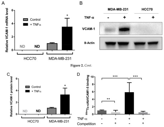 MDA-MB-231 cells overexpress VCAM-1 mRNA and protein upon TNF-α stimulation. MDA-MB-231 and HCC70 cells were treated or not for 18 h with TNF-α (50 ng/mL) and VCAM-1 expression was assessed by RT-qPCR (A) and WB (B). (C) Bands of WB were quantified using ImageJ software. (D) 99mTc-AbVCAM1-5 binding was performed on MDA-MB-231 cells stimulated or not with TNF-α, in the presence or absence of a 100-fold excess of unlabeled cAbVCAM1-5. Unspecific binding was estimated by 99mTc-AbVCAM1-5 incubation on HCC70 cells. Results are expressed in fold-change vs. untreated and unstimulated MDA-MB-231 N = 6 per condition. * p < 0.05; ** p < 0.01; *** p < 0.001; ND, not detected.