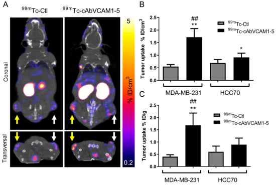 In vivo biodistribution of 99mTc-cAbVCAM1-5 in mice bearing HCC70 and MDA-MB-231 tumor xenografts. (A) Representative coronal and transversal views of fused SPECT/CT images of HCC70 (right hind limb, white arrow) and MDA-MB-231 (left hind limb, yellow arrow) tumor-bearing mice at 1 h after i.v injection of 99mTc-cAbVCA1M-5 or 99mTc-Ctl. (B) In vivo quantification of 99mTc-cAbVCAM1-5 and 99mTc-Ctl tumor uptake from SPECT images. (C) Ex vivo quantification of 99mTc-cAbVCAM1-5 and 99mTc-Ctl tumor uptake from post-mortem biodistribution studies. Results were expressed as % ID/cm3 (imaging) and % ID/g (ex vivo) of tumor. Statistics: * p < 0.05, ** p < 0.01 vs. 99mTc-Ctl; ## p < 0.01 vs. HCC70.