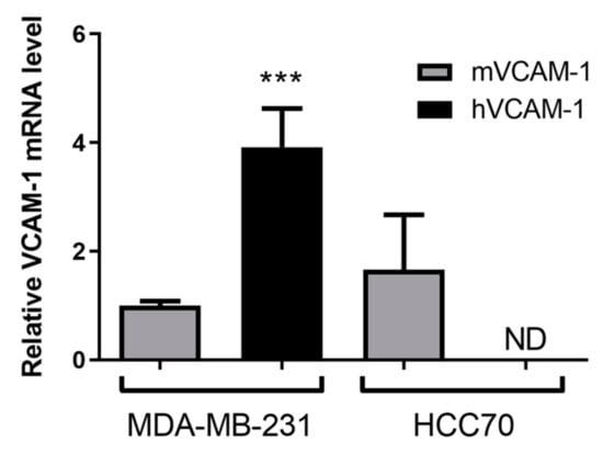 Ex vivo assessment of VCAM-1 expression by RT-qPCR. 50 mg of MDA-MB-231 and HCC70 xenografts were harvested and tested for human and mice VCAM-1 expression by RT-qPCR. *** p < 0.001 vs. MDA-MB-231 mVCAM-1.