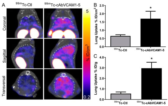 In vivo biodistribution of 99mTc-cAbVCAM1-5 in a pulmonary experimental metastasis model. (A) Representative coronal and transversal views of fused SPECT/CT images of MDA-MB-231 lung metastases at 1 h after i.v. injection of 99mTc-cAbVCAM1-5 or 99mTc-Ctl. (B) In vivo quantification of 99mTc-cAbVCAM1-5 and 99mTc-Ctl lung uptake from SPECT images. (C) Ex vivo quantification of 99mTc-cAbVCAM1-5 and 99mTc-Ctl lung uptake from post-mortem biodistribution studies. Results were expressed as % ID/cm3 (imaging) and % ID/g (ex vivo) of tumor. Statistics: * p < 0.05 vs. 99mTc-Ctl.