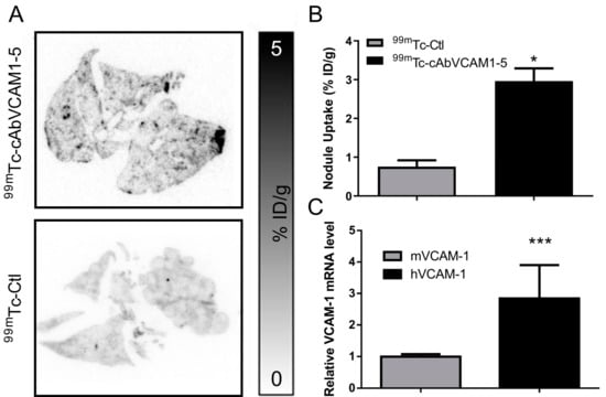 Ex vivo assessment of 99mTc-cAbVCAM1-5 uptake in metastatic nodules and assessment of VCAM-1 expression by RT-qPCR. (A) Autoradiography on 20 µm metastasis-containing lung slices. (B) Autoradiographic image quantification of 99mTc-cAbVCAM1-5 and 99mTc-Ctl uptake in MDA-MB-231 metastatic nodules. * p < 0.05 vs. 99mTc-Ctl. (C) 50 mg of lung containing metastases (MDA-MB-231) were harvested and tested for human and mice VCAM-1 expression by RT-qPCR. *** p < 0.001 vs. MDA-MB-231 mVCAM-1.