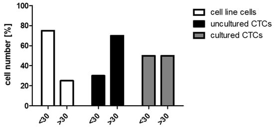 RNA quality of isolated single tumor cells. Signal intensities (Cq < 30: single cells with a Cq < 30 of ACTB and a Cq < 30 of KR19, Cq > 30: single cells with a Cq > 30 of ACTB and/or KR19) of single cell line cells (n = 8), uncultured CTCs (n = 23), and cultured CTCs (n = 10). CTCs: Circulating tumor cells