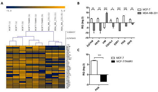 Gene expression of single cells and pools of isolated cell line cells. (A) Dendrogram and heat map analyses of Cq measurements of single MCF-7, MCF-7/TAMR1, and MDA-MB-231 cells (n = 2 per cell line) and pools of five cells (n = 1). Each gene is measured in triplicate. Data are mean centered, with mean expression responses to zero. Yellow indicates high expression and blue color represents downregulation relative to the mean of the pool. (B) Bar graph showing significant differences in transcript expression between MCF-7 and MDA-MB-231 cells (*, p < 0.05, ** p < 0.01, *** p < 0.001). (C) Bar graph showing significant differences in transcript expression between MCF-7 and MCF-7/TAMR1 cells (*** p < 0.001).