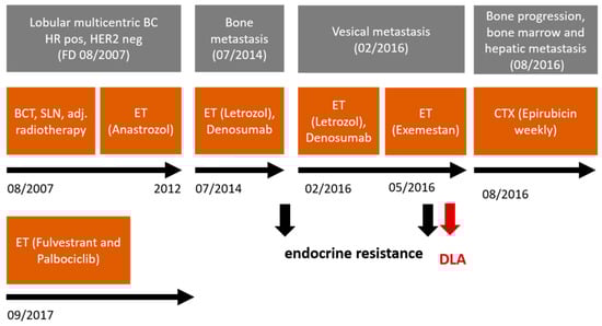 Clinical characteristics of the patient, who underwent DLA, and the therapeutic interventions administered to her are depicted in Figure 3. The Caucasian 65-year-old female patient was first diagnosed with a multi-centric right sided BC in 2007. Receptor status was positive for ER and PR (progesterone receptor) and negative for HER2 (human epidermal growth factor receptor 2). In the course of the disease, the patient developed bone, vesical, and hepatic metastatic lesions. DLA was performed when the patient suffered from a metastatic progress under ET with an aromatase inhibitor (AI).