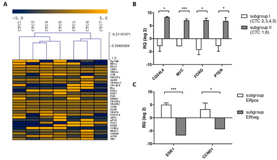 Gene expression of single CTCs. (A) Dendrogram and heat map analyses of Cq measurements of single CTCs (n = 7). Each gene is measured in triplicate. Data are mean centered, with mean expression responses to zero. Yellow indicates high expression and the blue color represents downregulation relative to the mean of the pool. (B) Bar graph showing significant differences in transcript expression between subgroup I (CTC 2,3,4,5) and subgroup II (CTC 1,6) (*, p < 0.05, *** p < 0.001). (C) Bar graph showing significant differences in transcript expression between the ER-positive CTC subgroup and the ER-negative CTC subgroup (* p < 0.05, *** p < 0.001).