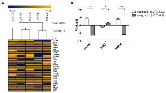 Gene expression of single cultured CTCs. (A) Dendrogram and heat map analyses of Cq measurements of single cCTCs (n = 5). Each gene is measured in triplicate. Data are mean centered, with mean expression responses to zero. Yellow indicates high expression and blue color represents downregulation relative to the mean of the pool. (B) Bar graph showing significant differences in transcript expression between subgroup I (cCTC 1, 2, 3) and subgroup II (cCTC 4, 5) (* p < 0.05, *** p < 0.001).