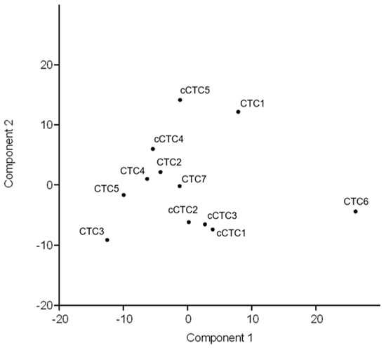 Combined gene expression analysis of single uncultured and cultured CTCs. PCA showed no clear distinction, but rather showed a partly combined grouping of CTCs (n = 7) and cCTCs (n = 5). Uncultured CTCs are distributed to a greater extent.
