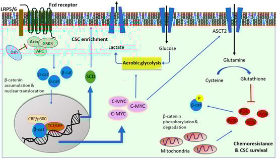 Overview of the role of the canonical Wnt/β-catenin pathway in cancer metabolism. Activation of Wnt signaling requires the binding of Wnt glycoproteins to the frizzled (Fzd) receptor and the low-density lipoprotein receptor-related protein (LRP5/6) co-receptor. Receptor activation leads to the inhibition of the destruction complex, Axin2/APC/GSK3 through the recruitment of disheveled (Dvl). β-catenin can then accumulate in cytoplasm and translocate to the nucleus where the TCF/LEF family of transcriptional factors activate a wide range of Wnt target genes. Through c-MYC, Wnt controls the increased aerobic glycolysis, glutamine transporter ASCT2 levels and subsequent glutathione (GSH) production, which is implicated in cancer chemoresistance and cancer stem cell (CSC) survival via the inhibition of reactive oxygen species (ROS). Wnt also upregulates stearoyl-CoA desaturase-1 (SCD), in particular SCD1, which has been considered as the hallmark for CSC enrichment.