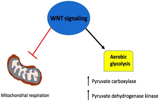 Wnt signaling in the metabolic reprogramming of cancer cells. The Wnt pathway upregulates aerobic glycolysis in part through its control of pyruvate carboxylase and pyruvate dehydrogenase kinase, enzymes that shift the metabolic requirement away from the mitochondrial oxidative phosphorylation (OXPHOS).