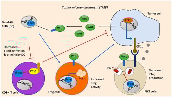 Natural Killer T (NKT) cells are specialized T cells that share properties of both innate Natural killer (NK) cells and adaptive T cells. Released cytokines from activated NKT cells regulate immune cells (NK cells, T cells and DCs, etc.) in the TME by releasing IFNγ and IL4, causing various anti-tumor responses []. In addition, NKT cells recognize glycolipid antigens in a CD1D-dependent manner and can directly kill tumor cells by releasing perforin. Wnt signaling is involved in NKT cell maturity and LEF-1 is known to regulate CD1D gene expression []. Recent evidence has also shown that β-catenin is essential in NKT development and differentiation as transgenic β-catenin expression increased the frequency and number of NKT cells that produce more type-2 cytokines []. While Wnt/β-catenin signaling is beneficial and required in NKT maturation in some studies, its aberrant activity has also been linked to poor terminal differentiation and function of NKT cells []. In addition, Kling et al. found that Wnt ligands and β-catenin activity in NKT cells suppressed IFNγ production [].