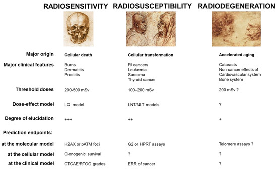 The major radiation-induced (RI) effects and their specific features. This figure aims to summarize the current basic knowledge of radiosensitivity, radiosusceptibility, and radiodegeneration. The threshold doses were reviewed in [2].
