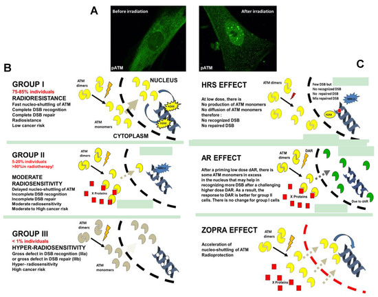 - Group III (<1% of the whole population) represents the ATM-mutated patients or those who show strong DSB repair defects, hyper-radiosensitivity, and either high cancer proneness or severe accelerated aging [40,79].