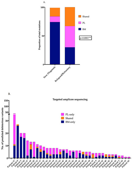2.3. Clonal Mutations in the BM are More Likely to Be Present in the PL