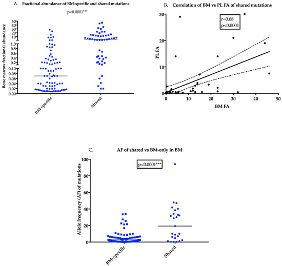 An analysis of the FA of OMD detected mutations in the BM comparing those mutations specific to the BM with those in both the BM and PL demonstrated significantly increased median FA levels for the shared mutations compared to BM-specific mutations (Figure 3A, p < 0.0001). Of the BM-specific mutations only 9/86 (or 10% of) had a FA > 1% whereas 32/52 (or 62% of) mutations present in both components had a FA > 1% in the BM. An XY-correlation plot for FA of BM vs. PL for shared mutations showed a 68% correlation (p < 0.0001, Figure 3B). TAS re-capitulated findings of the OMD with a significantly higher AF of shared mutations in the BM than BM-specific mutations (Figure 3C, p < 0.0001; Table S1)