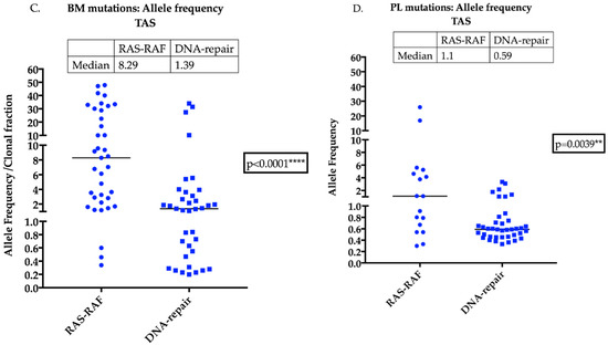 Analysis of TAS results indicated that the prevalence of mutations in the DNA-repair pathway was significantly higher than RAS-RAF pathway mutations when information from either the BM or PL was evaluated (Chi-square test, p =0.0095, Figure 5A). Furthermore, when the proportion of patients harbouring RAS-RAF and/or DNA-repair pathway mutations in the BM or BM + PL was compared it demonstrated that RAS-RAF pathway mutations were of equivalent frequency (67% for both BM and PL), whereas for the DNA-repair genes the proportion increased from 38% (BM) to 61% (BM + PL) (Figure 5B). The median AF of mutations detected in the BM or PL when compared between RAS-RAF and DNA-repair revealed that the median AF of RAS-RAF pathway mutations was significantly higher, both in the BM and PL compared to DNA-repair gene mutations (p < 0.0001 and p = 0.0039 respectively, Figure 5C,D). Finally, 16% of the patients had mutations in DNA-repair genes exclusively in the PL compared to only 2.5% of RAS-RAF pathway genes mutations (Table S1, data not shown).