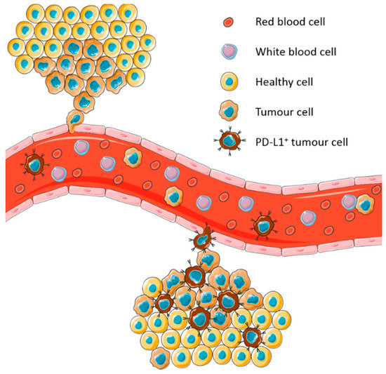 Circulating tumour cells (CTCs) have emerged as a potential alternative tumour sample to evaluate PD-L1 expression. CTCs have been demonstrated to express PD-L1 [33,34,35,36,37,38,39,40]. Moreover, they are expected to express the same immune escape mechanisms as the tumour that they arose from and represent the sum of all tumours in a patient at the time of collection (Figure 1). This has led to several studies assessing PD-L1 expression on NSCLC derived CTCs to determine its potential as a biomarker.