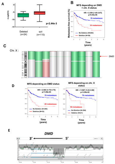 Three different types of deletion could be observed (Figure 1C): the entire X chromosome, the p arm of chromosome X, and within the DMD locus, which was the most frequent (61.1% of cases). To verify that the prognostic value of DMD deletion is not related to large alterations affecting the X chromosome but has a significant relevance by itself, metastasis-free survival (MFS) analysis was compared between non-deleted patients and patients with a targeted deletion of DMD (referred to as “DMD status”) or with a deletion of the p-arm or the entire X chromosome (referred to as “chr. X status”) (Figure 1D). MFS analysis showed that the greatest prognostic value was obtained by the narrowed DMD deletion and not by the loss of the p-arm or the entire X chromosome (Figure 1D), thus confirming that DMD deletion is an independent marker of metastatic evolution.