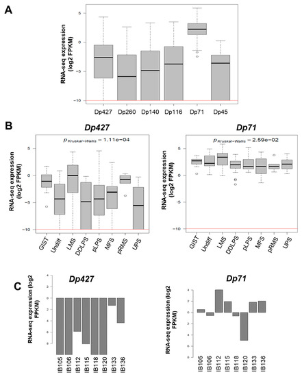 As illustrated in Figure 1E, DMD deletions were all restricted to the 5’ extremity of the genes, and consequently the 3’ region coding the Dp71 isoform was conserved. To quantify the respective expression of DMD isoforms, we re-analyzed RNA-sequencing data from a cohort of 145 sarcomas previously published by our lab [11]. All DMD isoforms had a low to very low level of expression, except for Dp71, which was significantly the most expressed among tumors (p < 0.0001) (Figure 2A). Dp427 expression was restricted to myogenic tumors (GIST, LMS, and pleomorphic RMS), whereas Dp71 was widely expressed across the histotypes (Figure 2B).