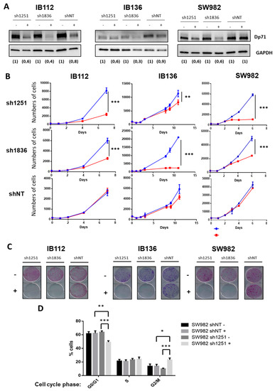 Dp71 inhibition reduced cell proliferation and clonogenicity. (A) Effective Dp71 inhibition by sh1251 and sh1836 was verified by Western blotting in IB112, IB136, and SW982 cell lines incubated for 72 h without or with doxycycline. Densitometry quantification is indicated below each lane. GAPDH was used as loading control. (B) Cells were counted by flow cytometry with six replicates for each time point. Doxycycline was added (in red) in order to induce Dp71 inhibition, or not (in blue), in culture medium. (C) Clonogenicity was measured with crystal violet staining after 12 days of cell culture with (+) or without (−) doxycycline. Then, plates were scanned. (D) After 72 h incubation with or without doxycycline, cells were trypsinized, fixed, stained with propidium iodide, and analyzed by flow cytometry. Results shown are representative of three independent experiments performed in duplicate. * p-value p < 0.05, ** p < 0.01, and *** p < 0.001.