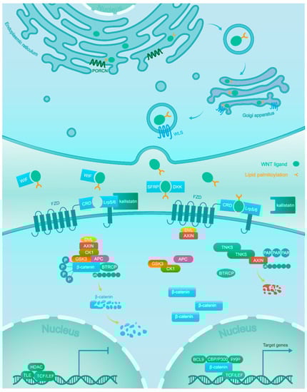 The Wnt/β-catenin signaling pathway is evolutionarily conserved and required in both physiological and pathophysiological processes [,,]. The association of Wnt ligands to corresponding receptors triggers the Wnt/β-catenin signaling pathway. These ligands are generated within the endoplasmic reticulum (ER), which undergoes palmitoylation by the Wnt acyl-transferase porcupine (PORCN). Next, Wntless (WLS) shuttles the palmitoylated ligands from the Golgi to the cell membrane, where they can signal in an autocrine or paracrine manner [].