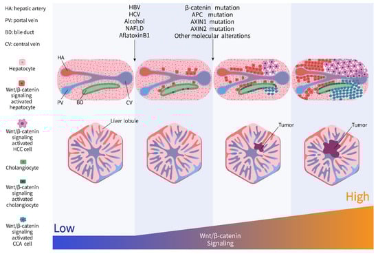 Non-alcoholic fatty liver disease (NAFLD), featuring fat accumulation in hepatocytes, ranges from simple steatosis to non-alcoholic steatohepatitis (NASH). The latter is associated with inflammation and fibrosis and is a major risk factor for the onset and progression of HCC []. From NAFLD to NASH and finally HCC, Wnt/β-catenin signaling is dynamically fine-tuned.