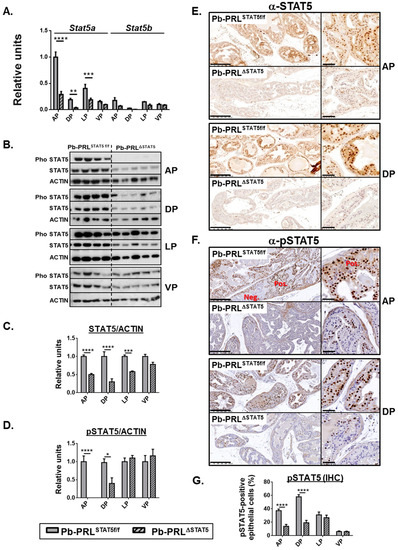 Lobe-specific pattern of STAT5 deletion in 6 month-old Pb-PRLΔSTAT5 mice. (A). Lobe-specific expression of Stat5a and Stat5b mRNA in Pb-PRLSTAT5f/f and Pb-PRLΔSTAT5 mice as determined by RT-qPCR is shown. (B–D). Lobe-specific expression and phosphorylation of STAT5 protein in Pb-PRLSTAT5f/f and Pb-PRLΔSTAT5 mice as determined by immunoblot is shown. Quantification of STAT5/ACTIN (C) and pSTAT5/ACTIN (D) was performed by densitometry and is shown as fold change versus Pb-PRLSTAT5f/f mice for each lobe. (E,F). Immunohistochemical analysis of STAT5 protein expression (E) and phosphorylation (F) in anterior (AP) and dorsal (DP) prostates of Pb-PRLSTAT5f/f and Pb-PRLΔSTAT5 mice, as indicated. In panel F, negatively (neg) next to positively (pos) immunostained areas are highlighted. See Figure S3 for the other lobes. (G). The percentage of pSTAT5-positive epithelial cells as determined using Calopix software is shown for each lobe. Statistics: Stars (* p < 0.05, ** p < 0.01, *** p < 0.001, **** p < 0.0001; idem in all figures below) denote significant differences in a repeated-measures two-way ANOVA with Sidak’s multiple comparisons. Size bars: 250 µm in large images and 50 µm in insets.