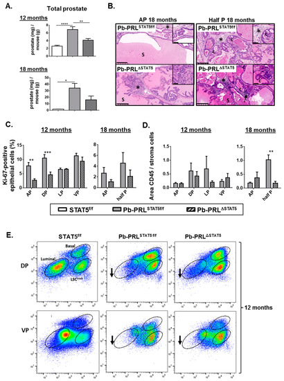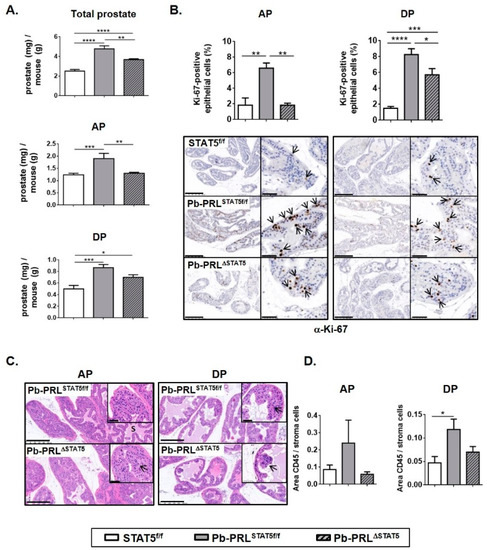 Taken together, our analyses support a protective role of Stat5 ablation against the early steps of PRL-triggered prostate tumorigenesis, weakening hyperplasia, lowering cell proliferation, and reducing chronic inflammation.