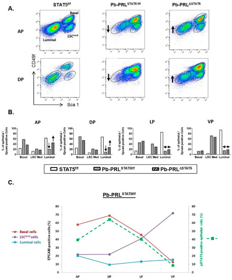 According to former reports involving Pb-PRL mice [30], this study confirmed that prostate hypertrophy was detectable from 3 months of age in Pb-PRLSTAT5f/f mice compared to control mice. At 6 months of age prostate weight was more than doubled compared to controls (Figure 2A). All lobes significantly contributed to prostate hypertrophy (Figure 2A and Figure S4A). This phenotype was primarily due to cell hyperplasia, as reflected by the higher number of cells obtained in cell sorting (see below Section 2.4) and was further magnified by the increase in prostatic secretions, especially in the anterior prostate. Prostate weight of Pb-PRLΔSTAT5 was significantly reduced compared to Pb-PRLSTAT5f/f mice, but remained higher than in control STAT5f/f mice (Figure 2A, top panel). In fact, anterior and dorsal lobes of Pb-PRLΔSTAT5 mice exhibited significant weight loss compared to their counterparts in Pb-PRLSTAT5f/f mice (Figure 2A, bottom panels), but this was not the case for ventral and lateral prostates (Figure S4A). These results are in agreement with the lobe-specific pattern of STAT5 signaling down-regulation described above.