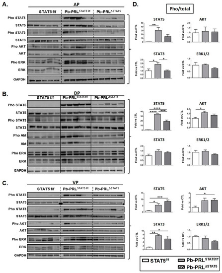 Virtually no basal phosphorylation could be detected for STAT5 in any lobe of STAT5f/f prostates, which contrasted with STAT3, ERK1/2, and AKT that all showed some background activation. Based on densitometric quantification, STAT5 was strongly activated in dorsal and anterior prostates of Pb-PRLSTAT5f/f mice, reaching >30-fold induction compared to control mice. Mild activation (<2 fold) of STAT3 (anterior lobe) and AKT (dorsal lobe) was also observed. In ventral prostate, STAT5 was also activated, but to a much lower degree (~5 fold) than in the other lobes, in agreement with IHC data (Figure S3B). In contrast to the other lobes, the degree of activation of STAT3 in ventral lobe (~7 fold) was in the same range as STAT5 activation. Finally, ERK1/2 was not significantly triggered by PRL in any lobe as shown by unchanged pho/total ERK1/2 ratio (Figure 4D). However, due to slightly enhanced expression of ERK1/2 protein in the anterior lobe of Pb-PRLSTAT5f/f prostates compared to STAT5f/f mice (Figure 4A), the tissue content in pERK1/2 in that lobe was significantly increased (p < 0.01), and the same trend (not significant) was observed in the other lobes (Figure 4B,C).