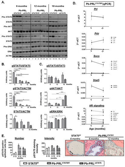 To understand further why the protective effect of STAT5 signaling inhibition observed at 6 months of age was progressively lost in old Pb-PRLΔSTAT5 mice, we compared the canonical PRLR signaling pathways in the dorsal prostates of the three genotypes at 6, 12, and 18 months of age (Figure 6A).