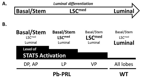 STAT5 signaling prevents luminal differentiation of the prostate epithelium. (A). Schematic representation of luminal differentiation placing LSCmed cells in-between basal and luminal cells. (B). The relative content in the three epithelial cell populations (basal/stem, LSCmed, luminal) in the various prostate lobes of 6-month old Pb-PRL mice or in WT mice (any lobe), as determined in Figure 3 is symbolized by the size of each population name. Below, the level of STAT5 activation in each lobe as determined in Figure 1 is also schematically represented by the black stair-bar. Based on these measurements, the highest the level of STAT5 activation, the lowest the level of epithelium differentiation was observed (see text for discussion).