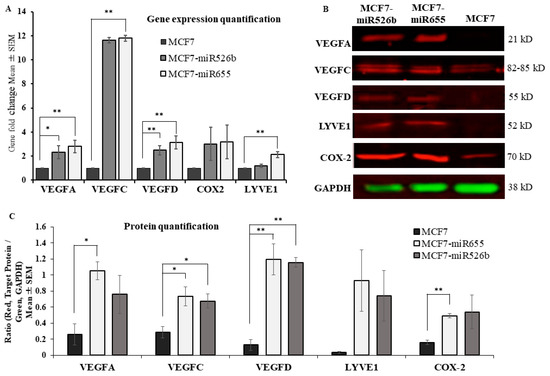 Overexpression of miR526b and miR655 in MCF7 cell line results in upregulation of angiogenesis and lymphangiogenesis markers. (A) Quantitative real time polymerase chain reaction (qRT-PCR) shows angiogenic and lymphangiogenic markers at the mRNA level with significant positive fold changes in the miRNA overexpressed cell lines, MCF7-miR526b and MCF7-miR655, compared with the MCF7 cell line. (B) The Western blot analysis shows a larger presence of angiogenesis and lymphangiogenesis markers at the protein level in the MCF7-miR655 and MCF7-miR526b cell lines compared with the MCF7 cell line. Green: control marker Glyceraldehyde 3-phosphate dehydrogenase (GAPDH), red: target proteins, either VEGFA or VEGFC or VEGFD or LYVE1 or COX-2. (C) Quantitative analysis of Western blot shows increased levels of angiogenesis and lymphangiogenesis markers. RT-PCR and Western blot quantitative data are presented as the mean ± SEM of triplicate replicates; * p < 0.05, ** p < 0.01. LYVE-1—lymphatic vessel endothelial hyaluronan receptor-1; VEGF—vascular endothelial growth factors; COX-2—cyclo-oxygenase 2.