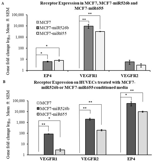 Overexpression of miR526b and miR655 in MCF7 or treatment of human umbilical vein endothelial cells (HUVECs) with miRNA-conditioned media results in upregulation of angiogenesis and lymphangiogenesis receptor markers. (A) Quantitative RT-PCR analysis shows significant upregulation of prostaglandin E2 receptor 4 (EP4), VEGF receptor 1 (VEGFR1), and VEGFR2 expression in the MCF7-miR526b and MCF7-miR655 cell lines, when compared with MCF7. (B) Quantitative RT-PCR analysis shows the HUVECs treated with MCF7-miR526b or MCF7-miR655 conditioned media have greater receptor gene expression compared with HUVECs treated with MCF7 conditioned media. RT-PCR quantitative data are presented as the mean ± SEM of triplicate replicates; * p < 0.05, ** p < 0.01.