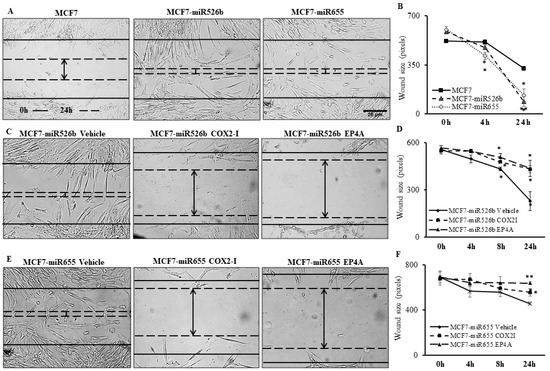 MCF7-miR526b and MCF7-miR655 conditioned media promotes cellular migration of HUVECs and inhibition of the COX2/EP4 signaling pathway abrogates these phenotypes. Baseline scratches represented by black line; wound size at 24 h represented by dashed line. (A) Images of migration assay with conditioned media from MCF7, MCF7-miR526b, and MCF7-miR655 at the 24 h time point. (B) Quantitative data representing wound size per time point in conditioned media from MCF7, MCF7-miR526b, or MCF7-miR655. (C) Images of migration assay with conditioned media from MCF7-miR526b with the addition of vehicle, COX2-I, or EP4A, at the 24 h time point. (D) Quantitative data representing wound size per time point in conditioned media from MCF7-miR526b with the addition of either vehicle, COX2-I, or EP4A. (E) Images of migration assay with conditioned media from MCF7-miR655 with the addition of vehicle, COX2-I, or EP4A, at the 24 h time point. (F) Quantitative data representing wound size per time point in conditioned media from MCF7-miR655 with the addition of either vehicle, COX2-I, or EP4A. Data shown as mean ± SEM of three biological replicates, including three experimental replicates per biological replicate; * p < 0.05, ** p< 0.01.