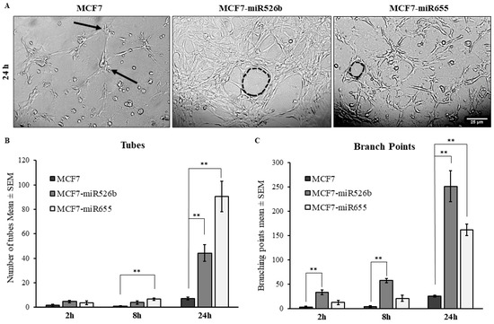 Overexpression of miR526b and miR655 results in an increase of tube formation of HUVECs. (A) Visual representation of tube formation of HUVECs at the 24 h time point in conditioned media from MCF7, MCF7-miR526b, or MCF7-miR655 cell line. Both tubes (dotted circle) and branching points (arrows) were greater in MCF7-miR526b or MCF7-miR655 conditioned media compared with MCF7 conditioned media. (B) Quantitative data represent number of tubes per time point, per condition. (C) Quantitative data represent number of branching points per time point, per condition. Quantitative data presented as the mean ± SEM of three biological replicates, including three experimental replicates per biological replicate; ** p < 0.01.