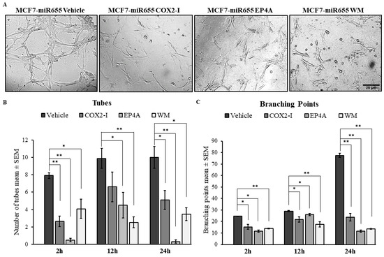 Treatment with COX2-I, EP4A, or PI3K pathway inhibitor (Wortmannin, WM) abrogates the tube formation stimulation abilities of MCF7-miR655 conditioned media. (A) Images of all treatments; miRNA-conditioned media with vehicle, COX2-I, EP4A, or PI3K inhibitor (WM) conditions at the 24 h time point. (B) Quantitative analysis of number of tubes formed per time point, per condition. (C) Quantitative analysis of branching points per time point, per condition. Quantitative data presented as the mean ± SEM of three biological replicates, including three experimental replicates per biological replicate; * p < 0.05, ** p < 0.01.