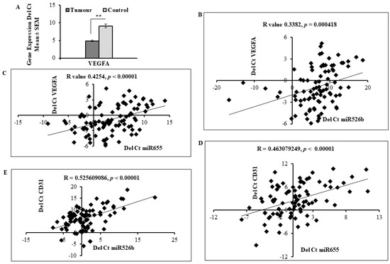 miR526b and miR655 expression is positively correlated with angiogenesis and vascular markers in human breast tumours. (A) qRT-PCR analysis of angiogenesis marker VEGFA mRNA expression in control (adjacent non-tumour) and tumoural tissues. Data are represented as mean ± SD. (**) indicates significant differences (p < 0.01). (B,C) miR526b and miR655 expression is positively correlated with VEGFA in primary breast cancer samples; Pearson’s coefficient indicates positive, but moderate correlations. (D,E) miR526b and miR655 expression level is positively correlated with CD31 in primary breast cancer samples. Pearson’s coefficient suggests moderate correlation between the two variables.